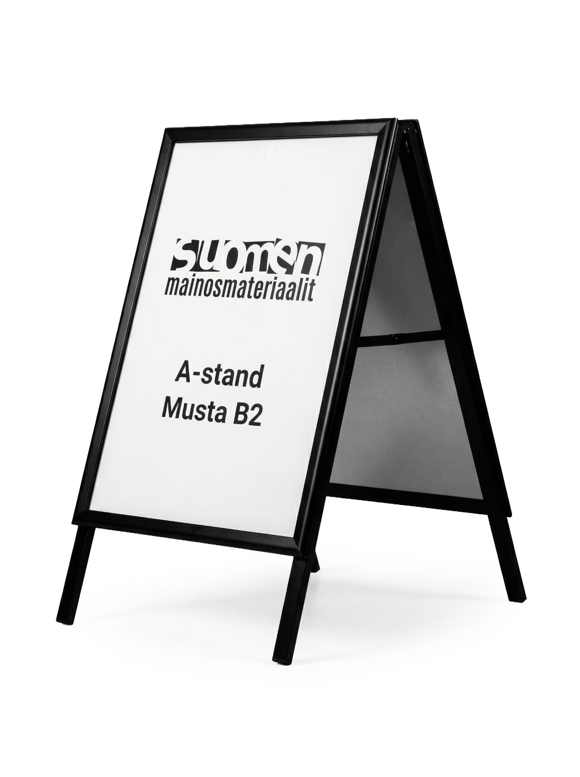 A-teline mustana B2-kokoisten julisteiden esillepanoon. Tukeva ja laadukas rakenne soveltuu sisä,- sekä ulkokäyttöön. Leveä 32 mm profiili, kestävä galvanoidusta teräksestä valmistettu takaosa. Mukana suojakalvo julisteille, joka suojaa mainosta uv-säteilyltä, kosteudelta ja lialta. Yksinkertainen tulosteiden vaihto snap-kehysten ansiosta. Suosittelemme ulkomainostelineisiin joko laminoitua tai synteettistä julistetta. Tilaa tyylikäs a-teline mustana jo tänään!